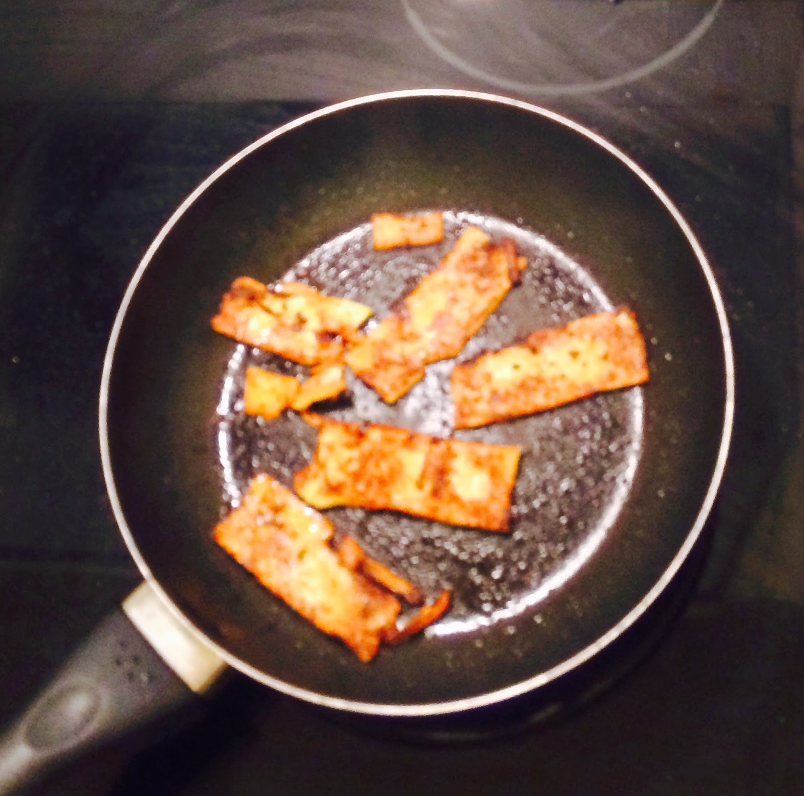 You guessed it the next step is to fry the tofu. I use a skillet and a little olive oil over medium high heat. Let the skillet and oil get hot, but not smoking before adding the tofu to the skillet. I usually cook it about 4-5 minutes on each side ( or until it gets a good crust).